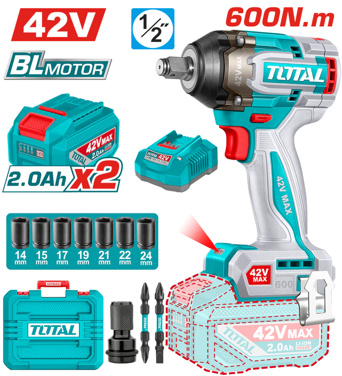 توتال تولز دريل بطارية براشليس 600 نيوتن 1/2 بوصة 42 فولت + 7 لقم + 2 بطارية + شاحن – TIWLI42602