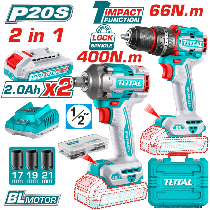 توتال تولز طقم ( شنيور + دريل )بطاريه 20 فولت 2 امبير+ 2 بطاريه و شاحن + طقم 47 قطعة – TCKLI20275