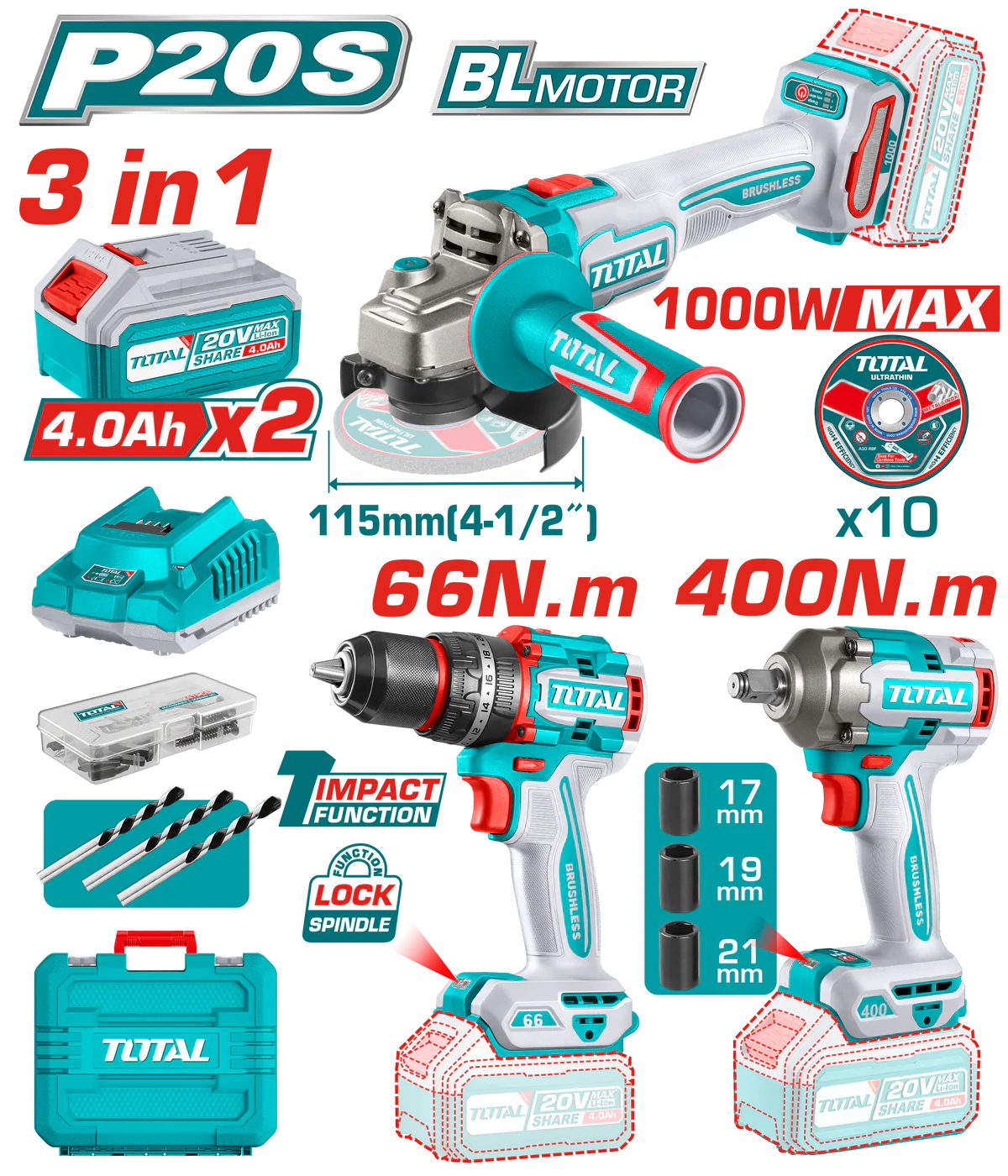 طقم احترافي متكامل يضم دريل صدمات براشلس 66Nm، مفتاح صدمات 400Nm، وزاوية طحن 1000W، جميعها تعمل على منصة بطارية 20 فولت، مع بطاريتين 4.0Ah، شاحن سريع، وطقم ملحقات كامل. مثالي لأعمال البناء، السيارات، والورش.